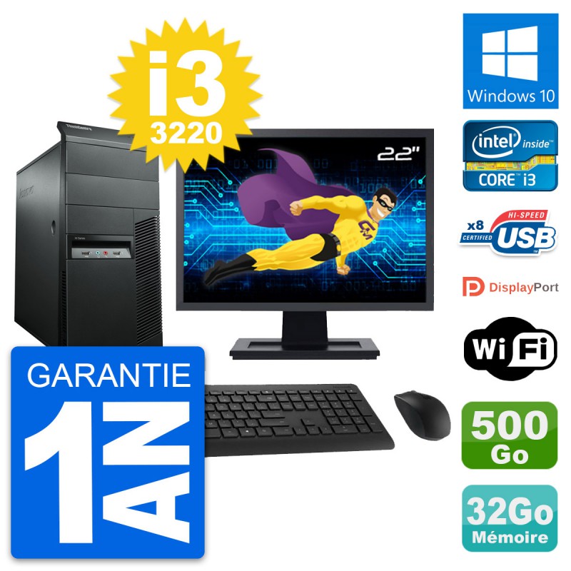 PC Tour Lenovo ThinkCentre M92p MT - Intel Core i3-3220 3.3 Ghz (3 Mo) - 32 Go DDR3 - Disque Dur 3,5" 500 Go - Clef Wifi USB - Windows 10 - Livré avec Ecran 22" + clavier + souris (Marques et modèles variables) - Garantie 1 an.