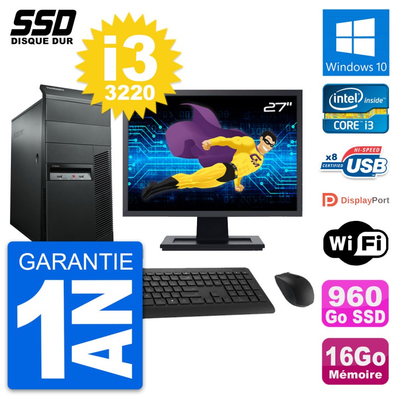 PC Tour Lenovo ThinkCentre M92p MT - Intel Core i3-3220 3.3 Ghz (3 Mo) - 16 Go DDR3 - Disque Dur SSD 960 Go - Clef Wifi USB - Windows 10 - Livré avec Ecran 27" + clavier + souris (Marques et modèles variables) - Garantie 1 an.