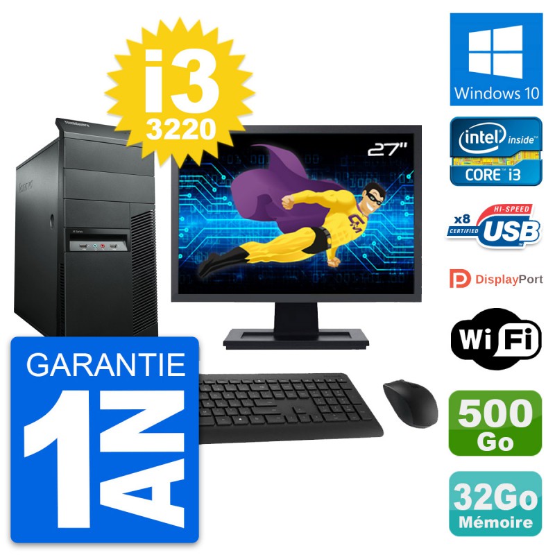 PC Tour Lenovo ThinkCentre M92p MT - Intel Core i3-3220 3.3 Ghz (3 Mo) - 32 Go DDR3 - Disque Dur 3,5" 500 Go - Clef Wifi USB - Windows 10 - Livré avec Ecran 27" + clavier + souris (Marques et modèles variables) - Garantie 1 an.