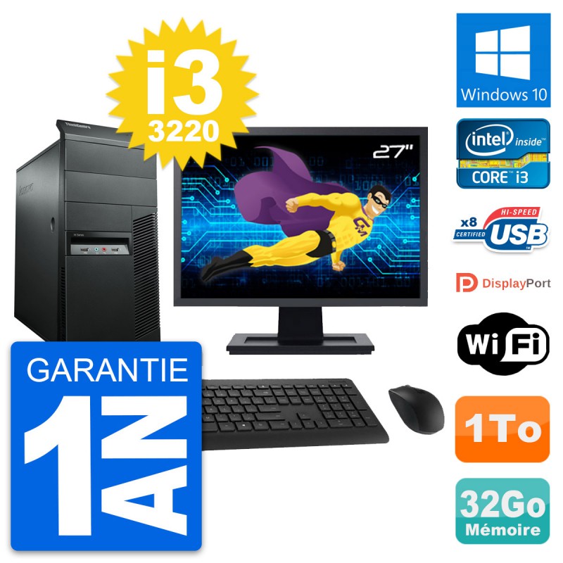 PC Tour Lenovo ThinkCentre M92p MT - Intel Core i3-3220 3.3 Ghz (3 Mo) - 32 Go DDR3 - Disque Dur 3,5" 1 To - Clef Wifi USB - Windows 10 - Livré avec Ecran 27" + clavier + souris (Marques et modèles variables) - Garantie 1 an.