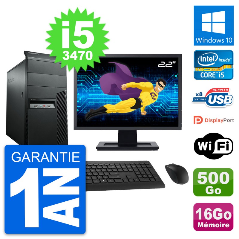 PC Tour Lenovo M92p Ecran 22" Core i5-3470 RAM 16Go Disque 500Go Windows 10 Wifi