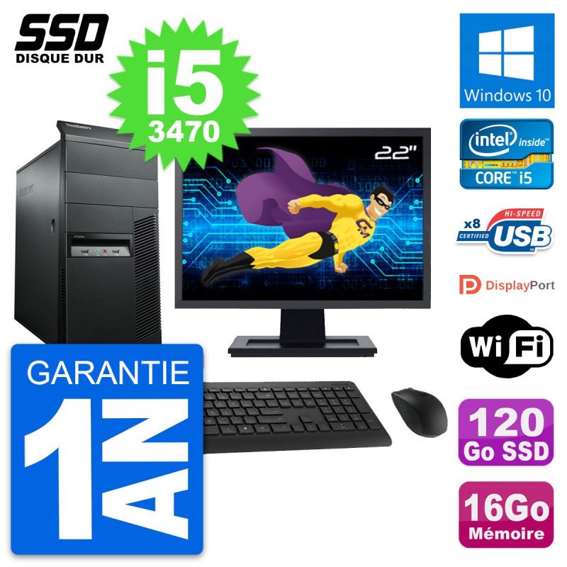 PC Tour Lenovo M92p Ecran 22" Intel i5-3470 RAM 16Go SSD 120Go Windows 10 Wifi