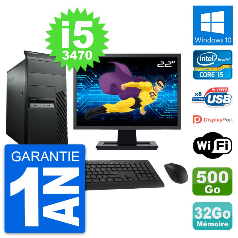 PC Tour Lenovo M92p Ecran 22" Core i5-3470 RAM 32Go Disque 500Go Windows 10 Wifi
