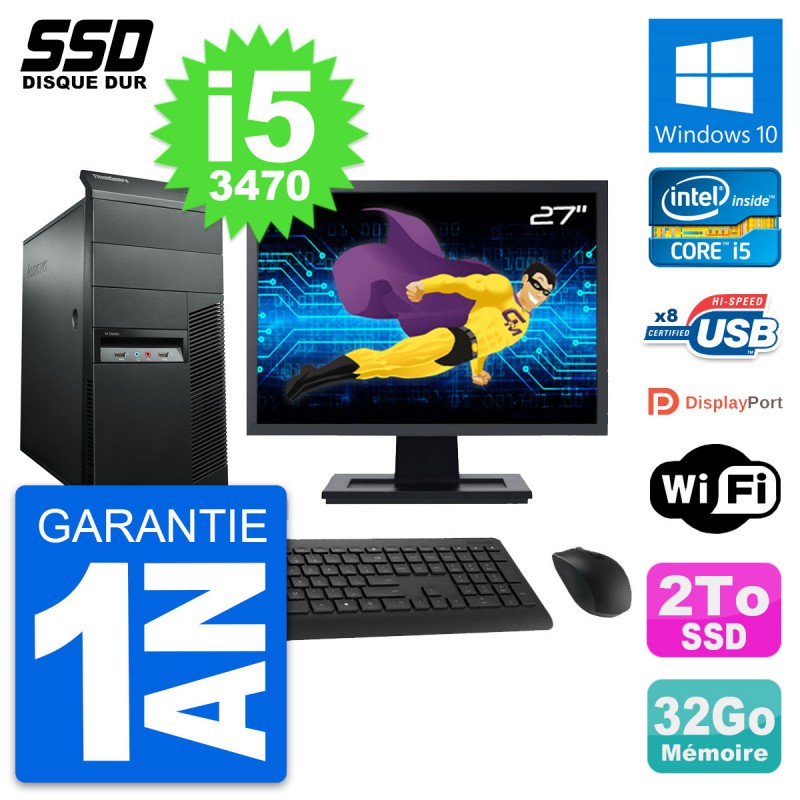 PC Tour Lenovo ThinkCentre M92p MT - Intel Core i5-3470 3.2 Ghz (6 Mo) - 32 Go DDR3 - Disque Dur SSD 2 To - Clef Wifi USB - Windows 10 - Livré avec Ecran 27" + clavier + souris (Marques et modèles variables) - Garantie 1 an.