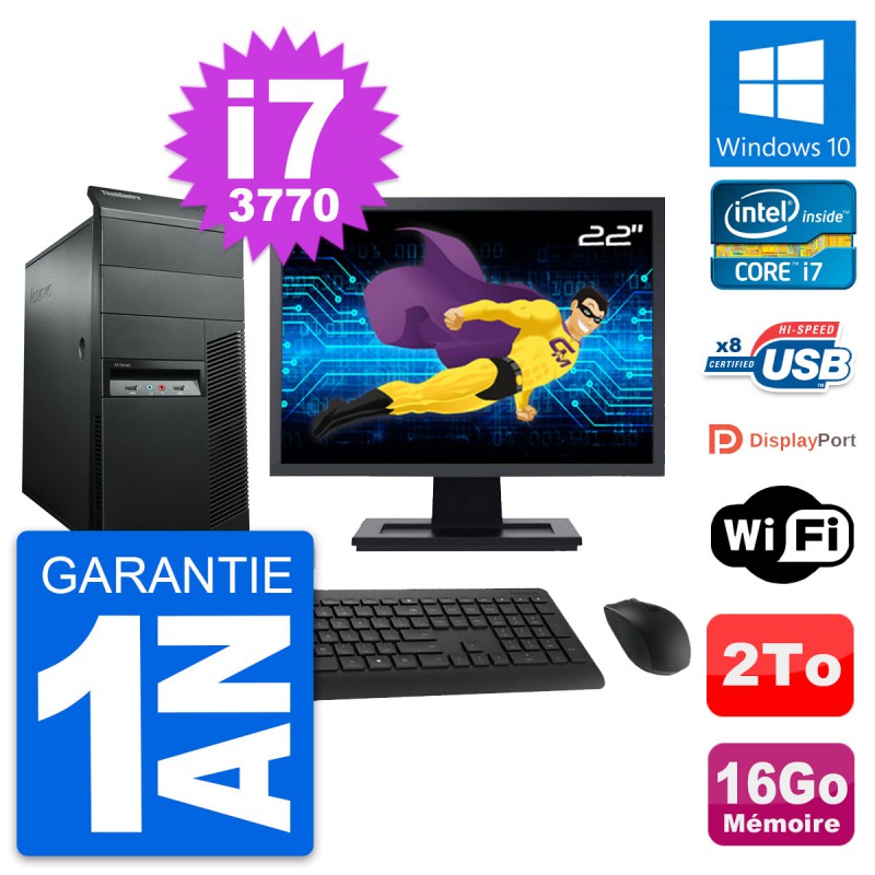 PC Tour Lenovo ThinkCentre M92p MT - Intel Core i7-3770 3.4 Ghz (8 Mo) - 16 Go DDR3 - Disque Dur 3,5" 2 To - Clef Wifi USB - Windows 10 - Livré avec Ecran 22" + clavier + souris (Marques et modèles variables) - Garantie 1 an.