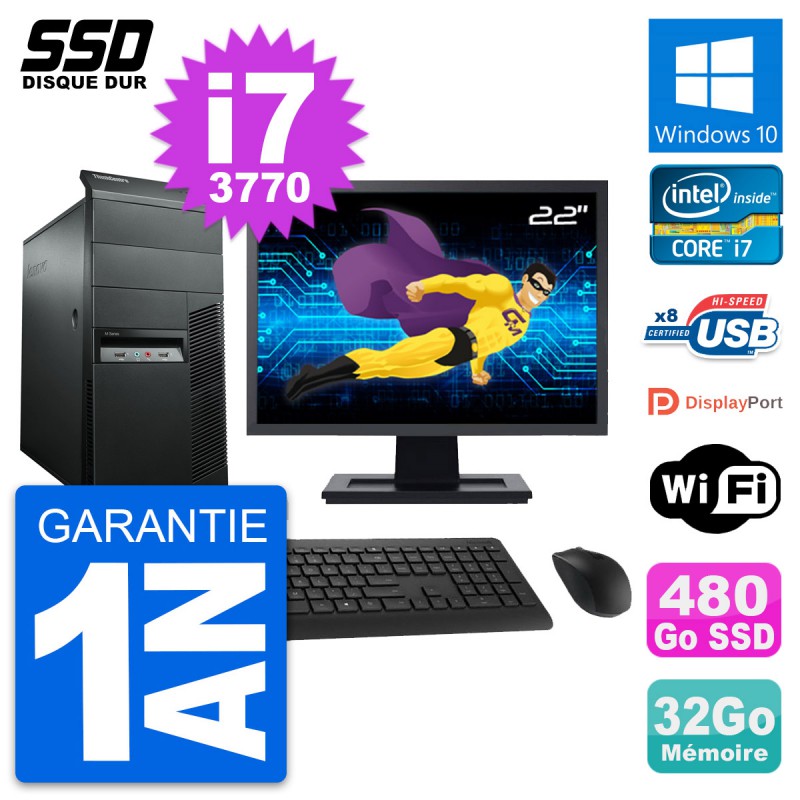 PC Tour Lenovo ThinkCentre M92p MT - Intel Core i7-3770 3.4 Ghz (8 Mo) - 32 Go DDR3 - Disque Dur SSD 480 Go - Clef Wifi USB - Windows 10 - Livré avec Ecran 22" + clavier + souris (Marques et modèles variables) - Garantie 1 an.