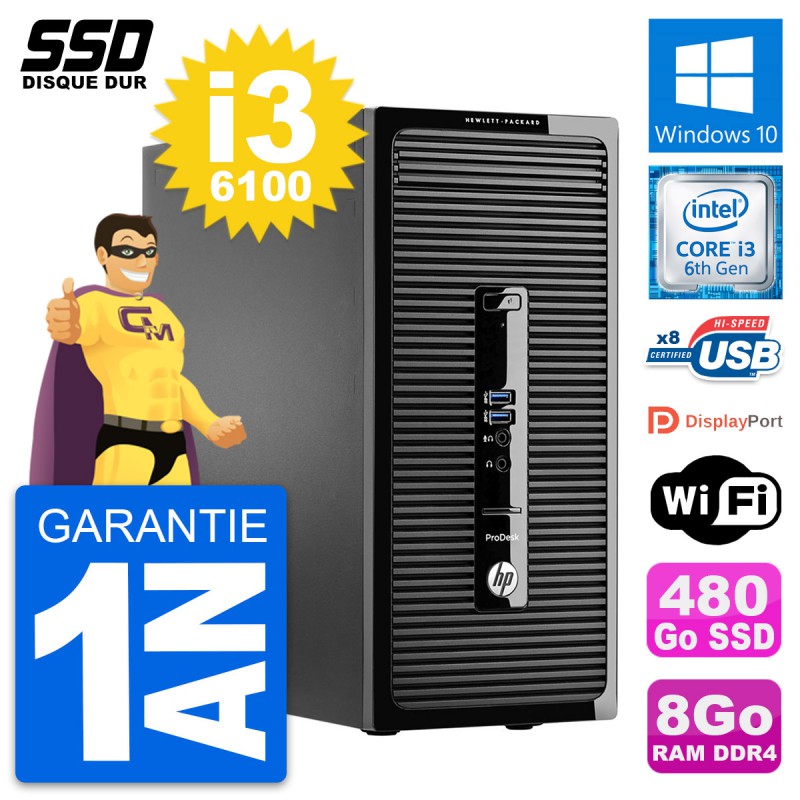 PC Tour HP ProDesk 400 G3 MT - Intel Core i3-6100 3.7 Ghz (3 Mo) - 8 Go DDR4 - SSD 480 Go - Clef Wifi USB - Windows 10 - Garantie 1 an.