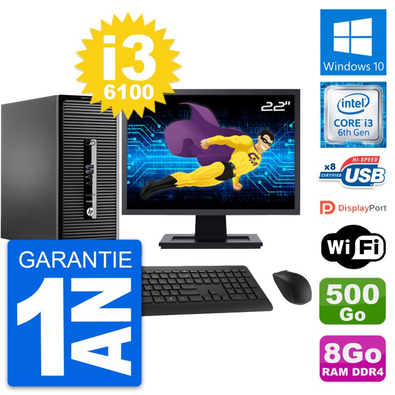 PC Tour HP ProDesk 400 G3 MT - Intel Core i3-6100 3.7 Ghz (3 Mo) - 8 Go DDR4 - Disque Dur 3,5" 500 Go - Clef Wifi USB - Windows 10 - Livré avec Ecran 22" + clavier + souris (Marques et modèles variables) - Garantie 1 an.