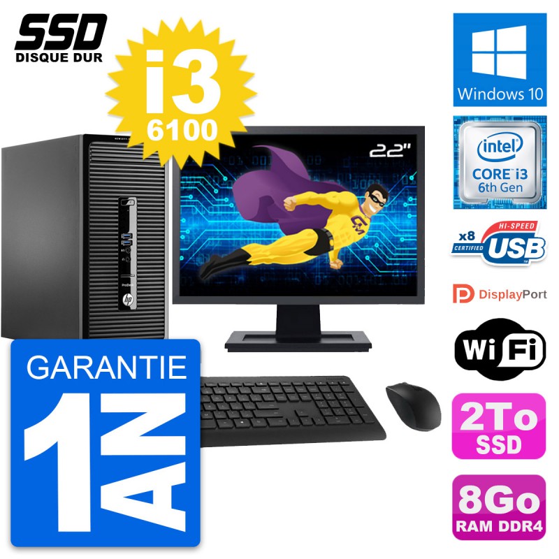 PC Tour HP ProDesk 400 G3 MT - Intel Core i3-6100 3.7 Ghz (3 Mo) - 8 Go DDR4 - SSD 2 To - Clef Wifi USB - Windows 10 - Livré avec Ecran 22" + clavier + souris (Marques et modèles variables) - Garantie 1 an.