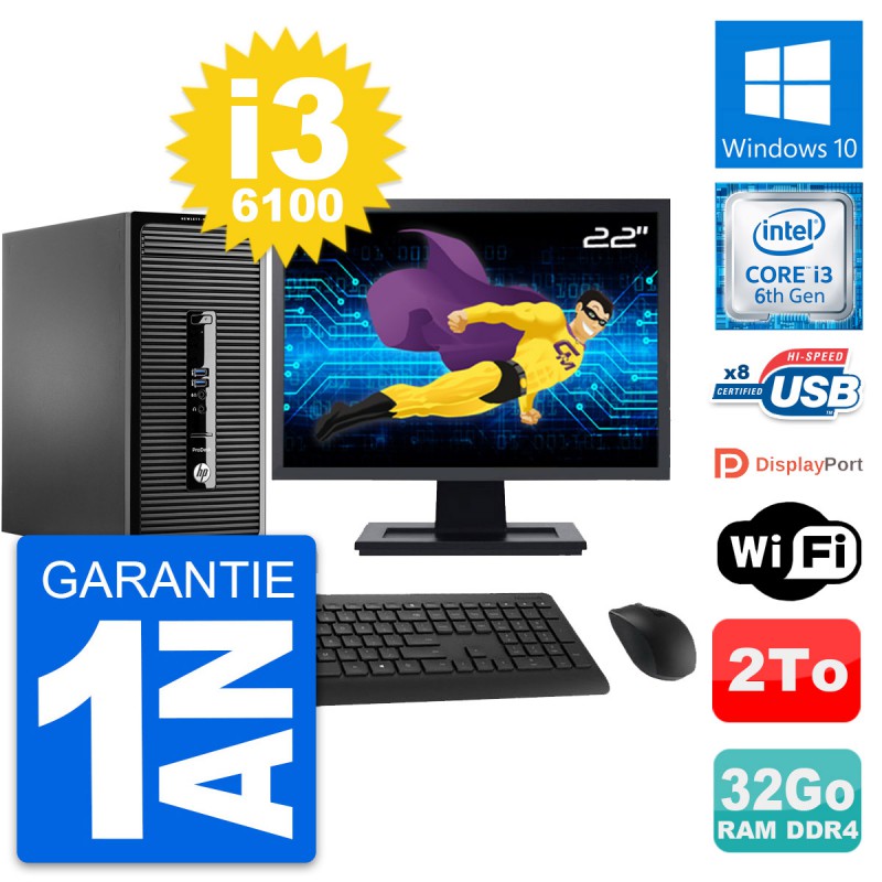 PC Tour HP ProDesk 400 G3 MT - Intel Core i3-6100 3.7 Ghz (3 Mo) - 32 Go DDR4 - Disque Dur 3,5" 2 To - Clef Wifi USB - Windows 10 - Livré avec Ecran 22" + clavier + souris (Marques et modèles variables) - Garantie 1 an.