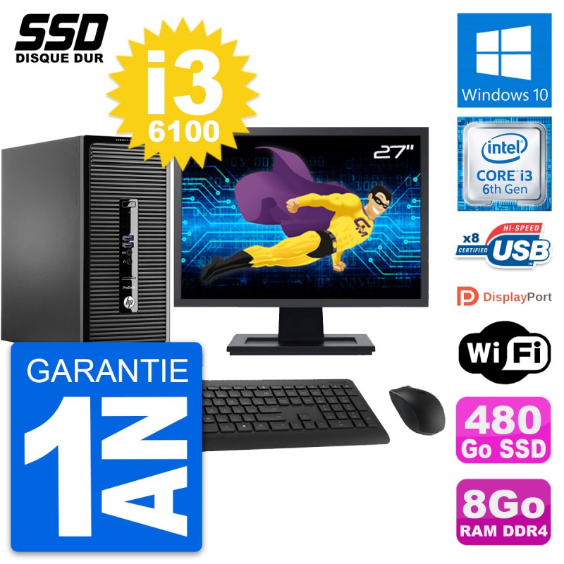 PC Tour HP ProDesk 400 G3 MT - Intel Core i3-6100 3.7 Ghz (3 Mo) - 8 Go DDR4 - SSD 480 Go - Clef Wifi USB - Windows 10 - Livré avec Ecran 27" + clavier + souris (Marques et modèles variables) - Garantie 1 an.