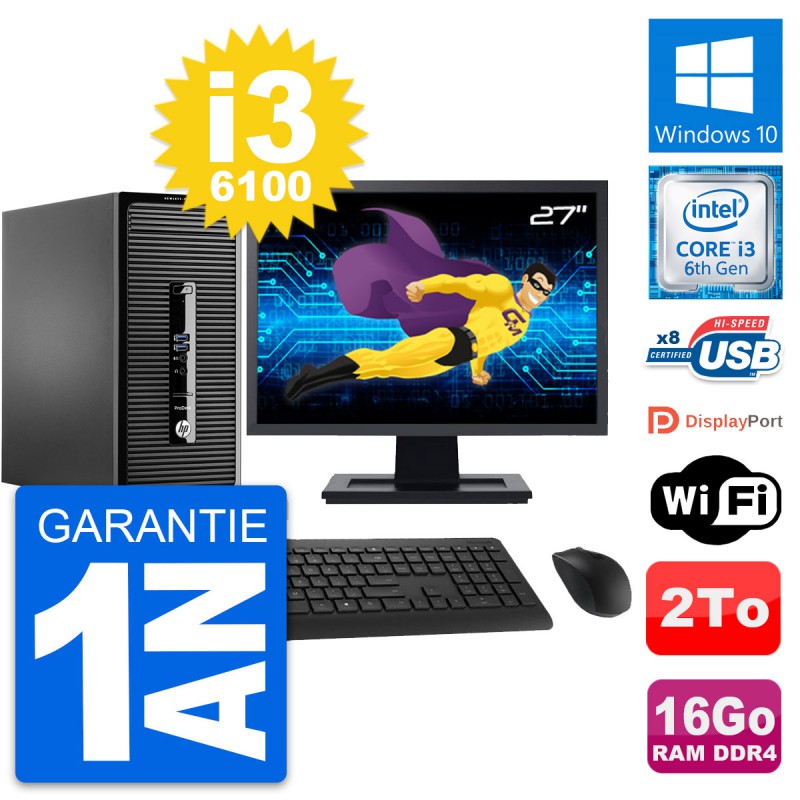PC Tour HP ProDesk 400 G3 MT - Intel Core i3-6100 3.7 Ghz (3 Mo) - 16 Go DDR4 - Disque Dur 3,5" 2 To - Clef Wifi USB - Windows 10 - Livré avec Ecran 27" + clavier + souris (Marques et modèles variables) - Garantie 1 an.