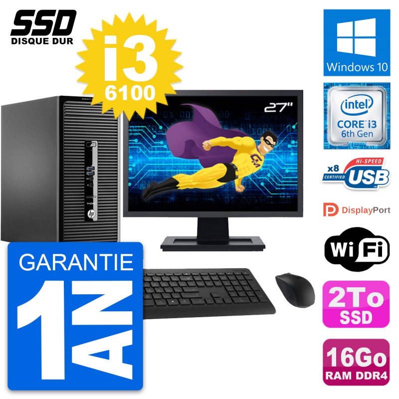 PC Tour HP ProDesk 400 G3 MT - Intel Core i3-6100 3.7 Ghz (3 Mo) - 16 Go DDR4 - SSD 2 To - Clef Wifi USB - Windows 10 - Livré avec Ecran 27" + clavier + souris (Marques et modèles variables) - Garantie 1 an.