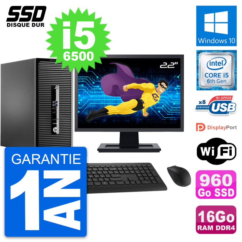 PC Tour HP ProDesk 400 G3 MT - Intel Core i5-6500 3.2 Ghz (6 Mo) - 16 Go DDR4 - SSD 960 Go - Clef Wifi USB - Windows 10 - Livré avec Ecran 22" + clavier + souris (Marques et modèles variables) - Garantie 1 an.