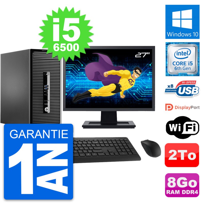 PC Tour HP ProDesk 400 G3 MT - Intel Core i5-6500 3.2 Ghz (6 Mo) - 8 Go DDR4 - Disque Dur 3,5" 2 To - Clef Wifi USB - Windows 10 - Livré avec Ecran 27" + clavier + souris (Marques et modèles variables) - Garantie 1 an.