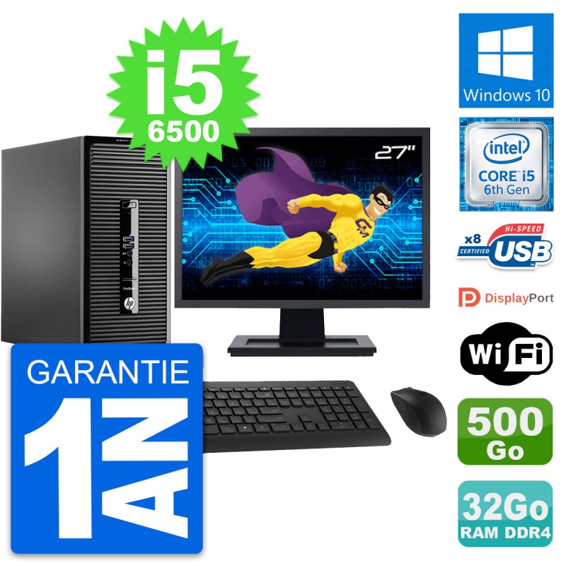PC Tour HP ProDesk 400 G3 MT - Intel Core i5-6500 3.2 Ghz (6 Mo) - 32 Go DDR4 - Disque Dur 3,5" 500 Go - Clef Wifi USB - Windows 10 - Livré avec Ecran 27" + clavier + souris (Marques et modèles variables) - Garantie 1 an.