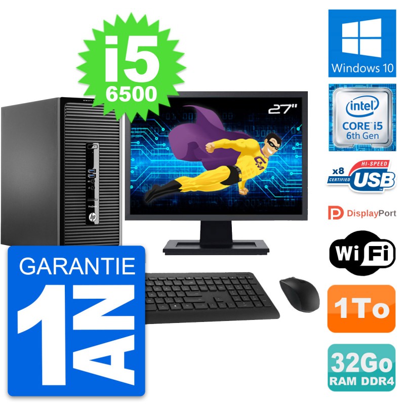 PC Tour HP ProDesk 400 G3 MT - Intel Core i5-6500 3.2 Ghz (6 Mo) - 32 Go DDR4 - Disque Dur 3,5" 1 To - Clef Wifi USB - Windows 10 - Livré avec Ecran 27" + clavier + souris (Marques et modèles variables) - Garantie 1 an.