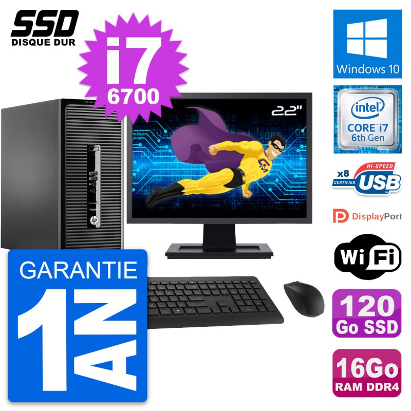 PC Tour HP ProDesk 400 G3 MT - Intel Core i7-6700 3.4 Ghz (8 Mo) - 16 Go DDR4 - SSD 120 Go - Clef Wifi USB - Windows 10 - Livré avec Ecran 22" + clavier + souris (Marques et modèles variables) - Garantie 1 an.