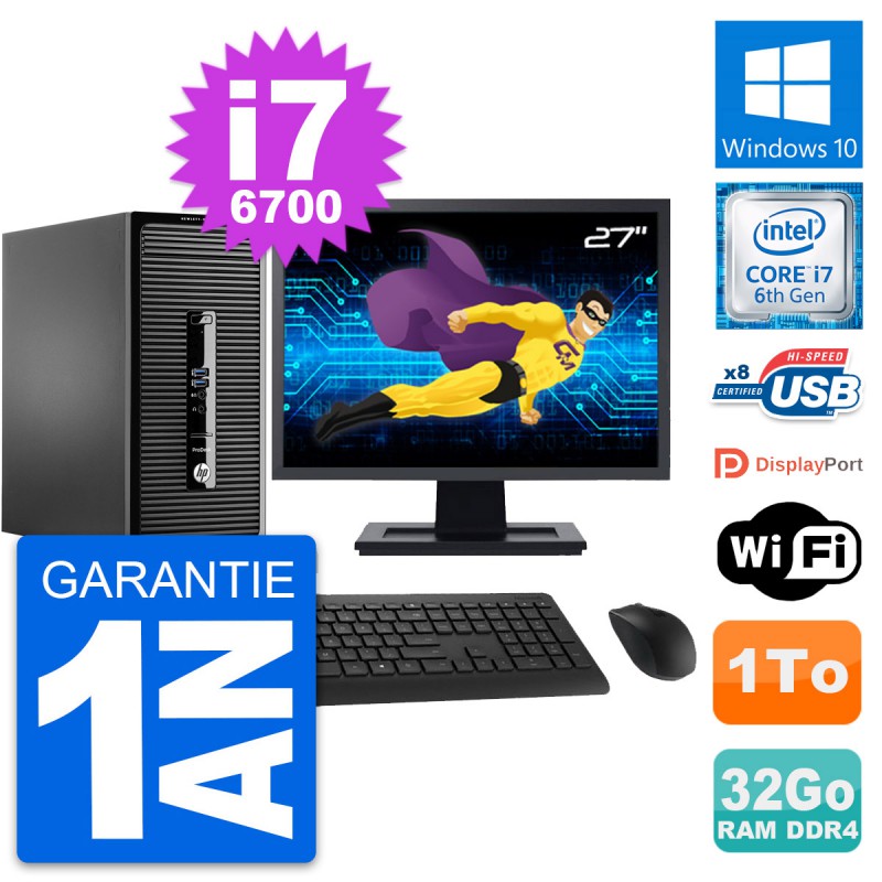 PC Tour HP ProDesk 400 G3 MT - Intel Core i7-6700 3.4 Ghz (8 Mo) - 32 Go DDR4 - Disque Dur 3,5" 1 To - Clef Wifi USB - Windows 10 - Livré avec Ecran 27" + clavier + souris (Marques et modèles variables) - Garantie 1 an.