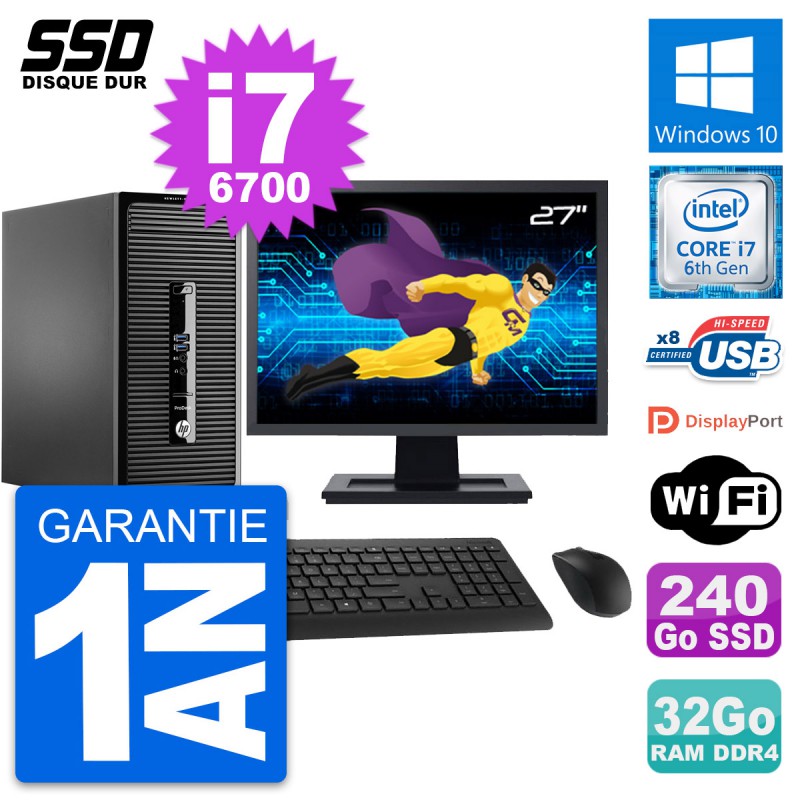 PC Tour HP ProDesk 400 G3 MT - Intel Core i7-6700 3.4 Ghz (8 Mo) - 32 Go DDR4 - SSD 240 Go - Clef Wifi USB - Windows 10 - Livré avec Ecran 27" + clavier + souris (Marques et modèles variables) - Garantie 1 an.