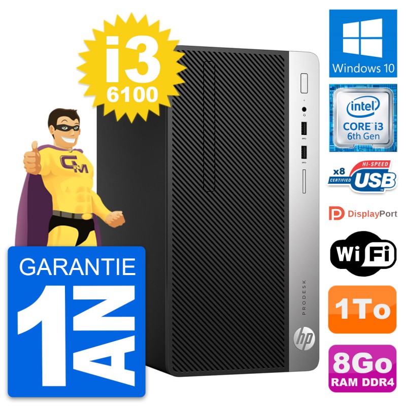 PC Tour HP ProDesk 400 G4 MT - Intel Core i3-6100 3.7 Ghz (3 Mo) - 8 Go DDR4 - Disque Dur 3,5" 1 To - Clef Wifi USB - Windows 10 - Garantie 1 an.