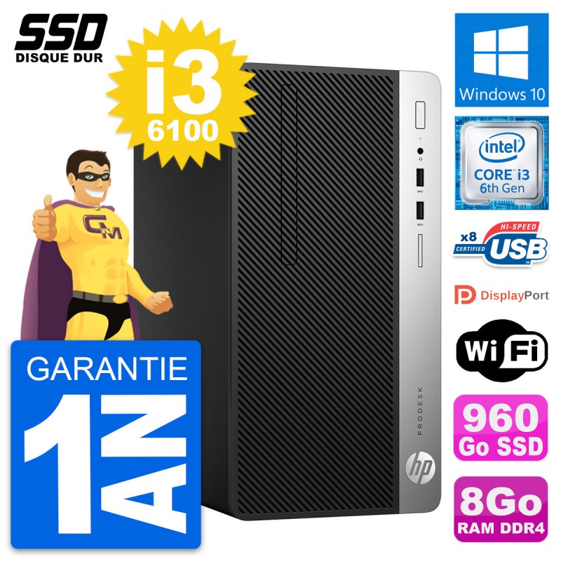 PC Tour HP ProDesk 400 G4 MT - Intel Core i3-6100 3.7 Ghz (3 Mo) - 8 Go DDR4 - SSD 960 Go - Clef Wifi USB - Windows 10 - Garantie 1 an.