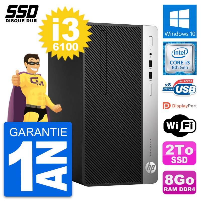 PC Tour HP ProDesk 400 G4 MT - Intel Core i3-6100 3.7 Ghz (3 Mo) - 8 Go DDR4 - SSD 2 To - Clef Wifi USB - Windows 10 - Garantie 1 an.