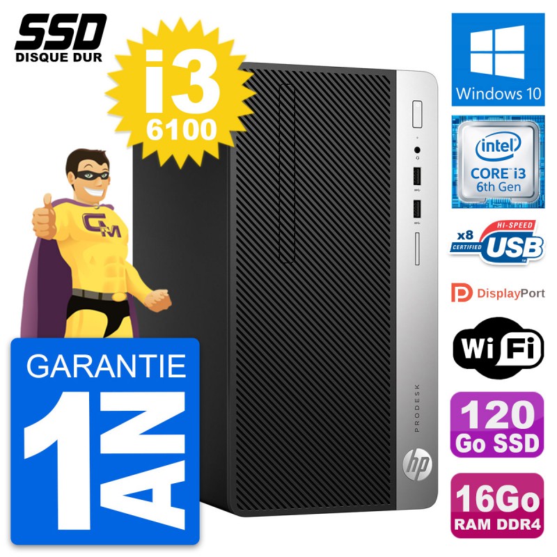 PC Tour HP ProDesk 400 G4 MT - Intel Core i3-6100 3.7 Ghz (3 Mo) - 16 Go DDR4 - SSD 120 Go - Clef Wifi USB - Windows 10 - Garantie 1 an.