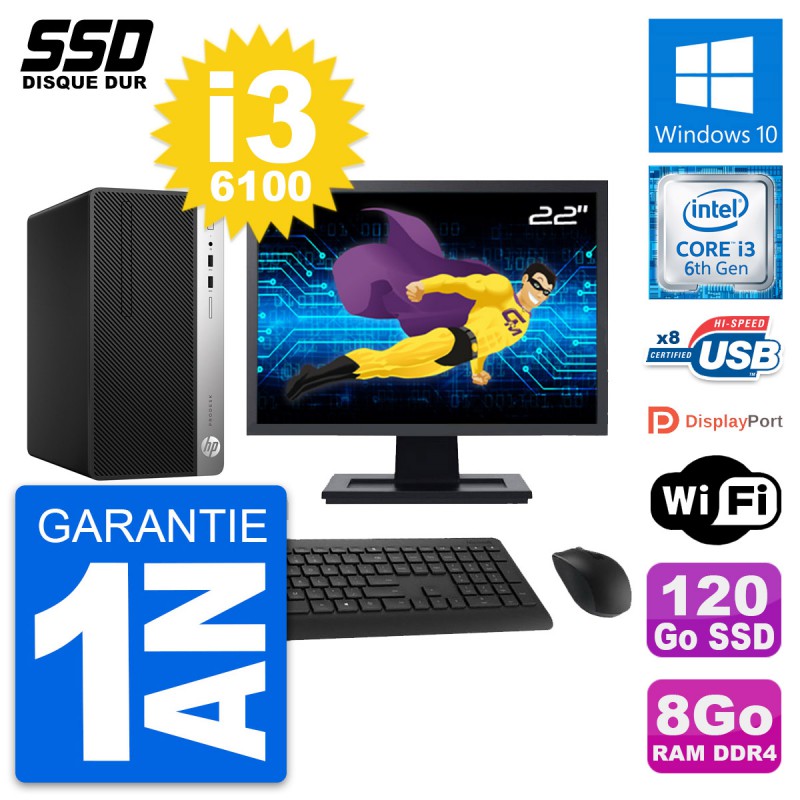 PC Tour HP ProDesk 400 G4 MT - Intel Core i3-6100 3.7 Ghz (3 Mo) - 8 Go DDR4 - SSD 120 Go - Clef Wifi USB - Windows 10 - Livré avec Ecran 22" + clavier + souris (Marques et modèles variables) - Garantie 1 an.
