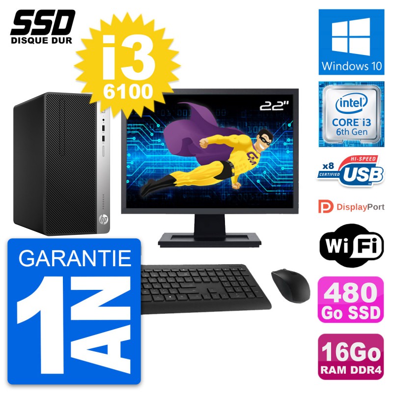 PC Tour HP ProDesk 400 G4 MT - Intel Core i3-6100 3.7 Ghz (3 Mo) - 16 Go DDR4 - SSD 480 Go - Clef Wifi USB - Windows 10 - Livré avec Ecran 22" + clavier + souris (Marques et modèles variables) - Garantie 1 an.