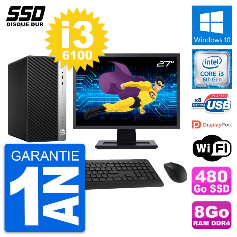 PC Tour HP ProDesk 400 G4 MT - Intel Core i3-6100 3.7 Ghz (3 Mo) - 8 Go DDR4 - SSD 480 Go - Clef Wifi USB - Windows 10 - Livré avec Ecran 27" + clavier + souris (Marques et modèles variables) - Garantie 1 an.