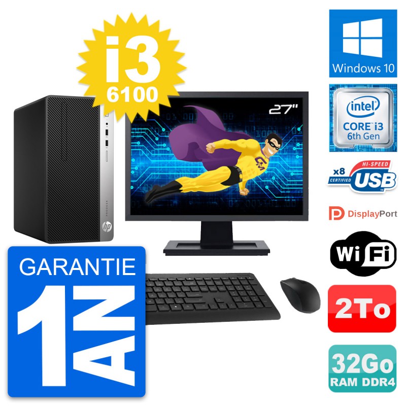 PC Tour HP ProDesk 400 G4 MT - Intel Core i3-6100 3.7 Ghz (3 Mo) - 32 Go DDR4 - Disque Dur 3,5" 2 To - Clef Wifi USB - Windows 10 - Livré avec Ecran 27" + clavier + souris (Marques et modèles variables) - Garantie 1 an.
