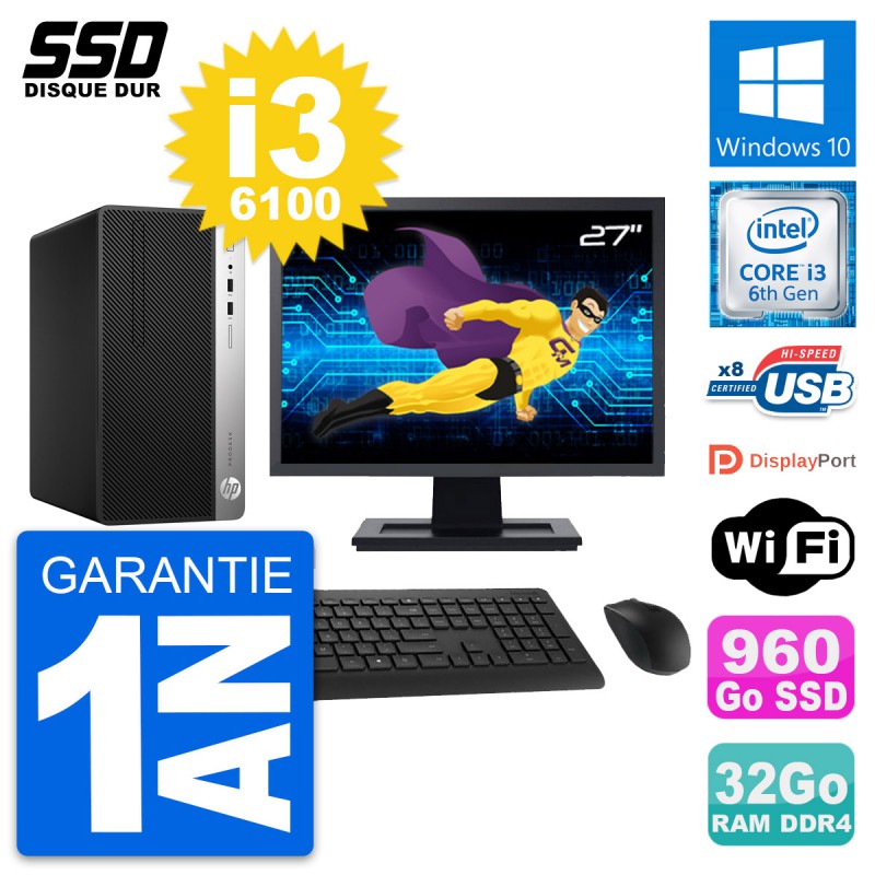 PC Tour HP ProDesk 400 G4 MT - Intel Core i3-6100 3.7 Ghz (3 Mo) - 32 Go DDR4 - SSD 960 Go - Clef Wifi USB - Windows 10 - Livré avec Ecran 27" + clavier + souris (Marques et modèles variables) - Garantie 1 an.