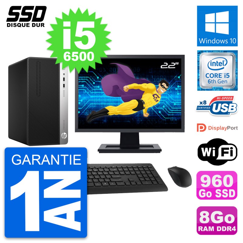 PC Tour HP ProDesk 400 G4 MT - Intel Core i5-6500 3.2 Ghz (6 Mo) - 8 Go DDR4 - SSD 960 Go - Clef Wifi USB - Windows 10 - Livré avec Ecran 22" + clavier + souris (Marques et modèles variables) - Garantie 1 an.