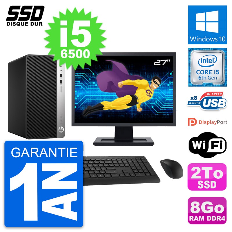 PC Tour HP ProDesk 400 G4 MT - Intel Core i5-6500 3.2 Ghz (6 Mo) - 8 Go DDR4 - SSD 2 To - Clef Wifi USB - Windows 10 - Livré avec Ecran 27" + clavier + souris (Marques et modèles variables) - Garantie 1 an.