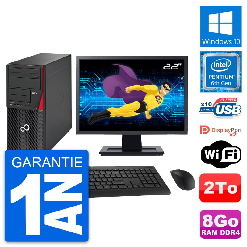 PC Tour Fujitsu Esprimo P756 MT - Intel Pentium Dual-Core G4400 3.3 Ghz (3 Mo) - 8 Go DDR4 - Disque Dur 3,5" 2 To - Clef Wifi USB - Graveur DVD - Windows 10 - Livré avec Ecran 22" + clavier + souris (Marques et modèles variables) - Garantie 1 an.