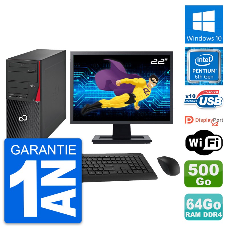 PC Tour Fujitsu Esprimo P756 MT - Intel Pentium Dual-Core G4400 3.3 Ghz (3 Mo) - 64 Go DDR4 - Disque Dur 3,5" 500 Go - Clef Wifi USB - Graveur DVD - Windows 10 - Livré avec Ecran 22" + clavier + souris (Marques et modèles variables) - Garantie 1 an.