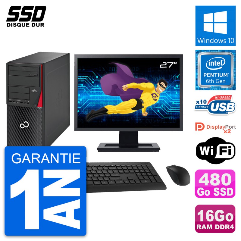 PC Tour Fujitsu Esprimo P756 MT - Intel Pentium Dual-Core G4400 3.3 Ghz (3 Mo) - 16 Go DDR4 - SSD 480 Go - Clef Wifi USB - Graveur DVD - Windows 10 - Livré avec Ecran 27" + clavier + souris (Marques et modèles variables) - Garantie 1 an.