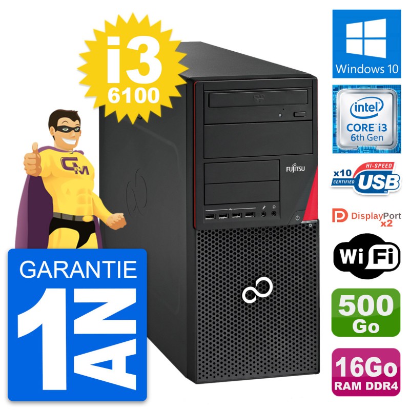 PC Tour Fujitsu Esprimo P756 MT - Intel Core i3-6100 3.7 Ghz (3 Mo) - 16 Go DDR4 - Disque Dur 3,5" 500 Go - Clef Wifi USB - Graveur DVD - Windows 10 - Garantie 1 an.