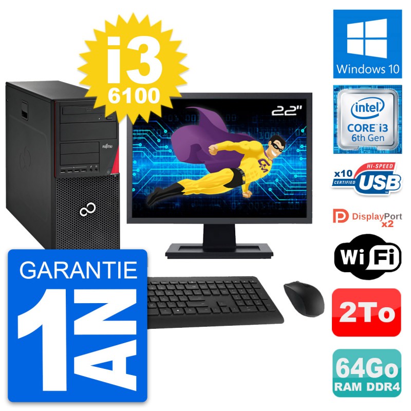 PC Tour Fujitsu Esprimo P756 MT - Intel Core i3-6100 3.7 Ghz (3 Mo) - 64 Go DDR4 - Disque Dur 3,5" 2 To - Clef Wifi USB - Graveur DVD - Windows 10 - Livré avec Ecran 22" + clavier + souris (Marques et modèles variables) - Garantie 1 an.