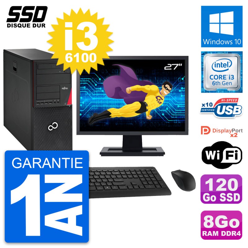 PC Tour Fujitsu Esprimo P756 MT - Intel Core i3-6100 3.7 Ghz (3 Mo) - 8 Go DDR4 - SSD 120 Go - Clef Wifi USB - Graveur DVD - Windows 10 - Livré avec Ecran 27" + clavier + souris (Marques et modèles variables) - Garantie 1 an.
