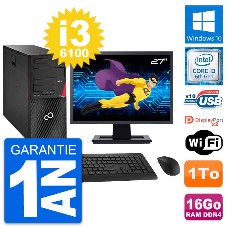 PC Tour Fujitsu Esprimo P756 MT - Intel Core i3-6100 3.7 Ghz (3 Mo) - 16 Go DDR4 - Disque Dur 3,5" 1 To - Clef Wifi USB - Graveur DVD - Windows 10 - Livré avec Ecran 27" + clavier + souris (Marques et modèles variables) - Garantie 1 an.