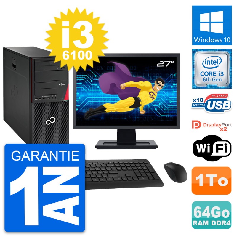 PC Tour Fujitsu Esprimo P756 MT - Intel Core i3-6100 3.7 Ghz (3 Mo) - 64 Go DDR4 - Disque Dur 3,5" 1 To - Clef Wifi USB - Graveur DVD - Windows 10 - Livré avec Ecran 27" + clavier + souris (Marques et modèles variables) - Garantie 1 an.