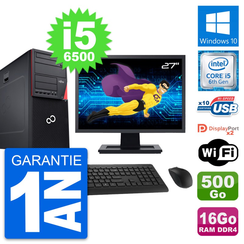 PC Tour Fujitsu Esprimo P756 MT - Intel Core i5-6500 3.2 Ghz (6 Mo) - 16 Go DDR4 - Disque Dur 3,5" 500 Go - Clef Wifi USB - Graveur DVD - Windows 10 - Livré avec Ecran 27" + clavier + souris (Marques et modèles variables) - Garantie 1 an.