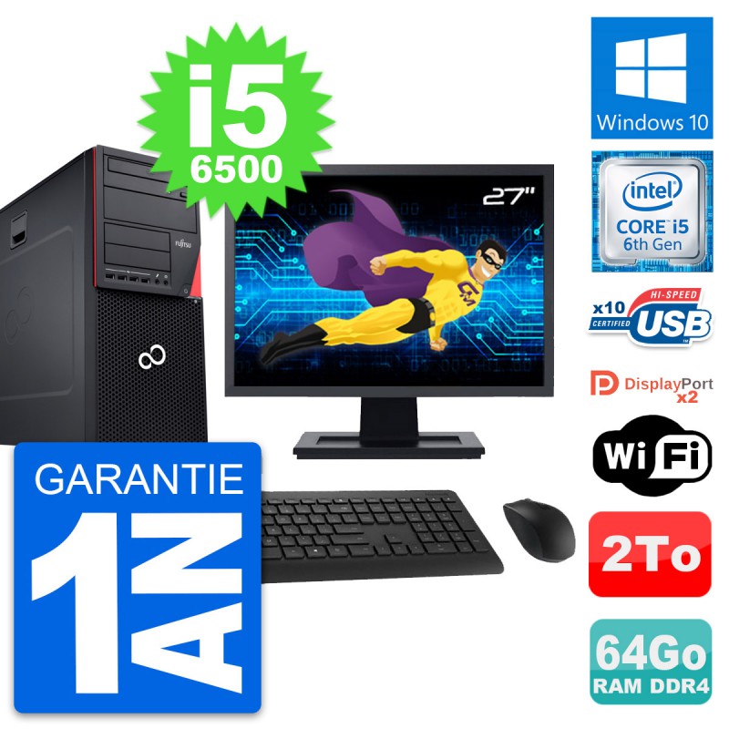 PC Tour Fujitsu Esprimo P756 MT - Intel Core i5-6500 3.2 Ghz (6 Mo) - 64 Go DDR4 - Disque Dur 3,5" 2 To - Clef Wifi USB - Graveur DVD - Windows 10 - Livré avec Ecran 27" + clavier + souris (Marques et modèles variables) - Garantie 1 an.