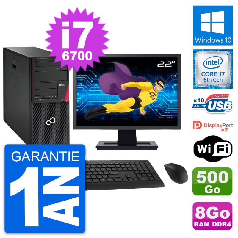 PC Tour Fujitsu Esprimo P756 MT - Intel Core i7-6700 3.4 Ghz (8 Mo) - 8 Go DDR4 - Disque Dur 3,5" 500 Go - Clef Wifi USB - Graveur DVD - Windows 10 - Livré avec Ecran 22" + clavier + souris (Marques et modèles variables) - Garantie 1 an.