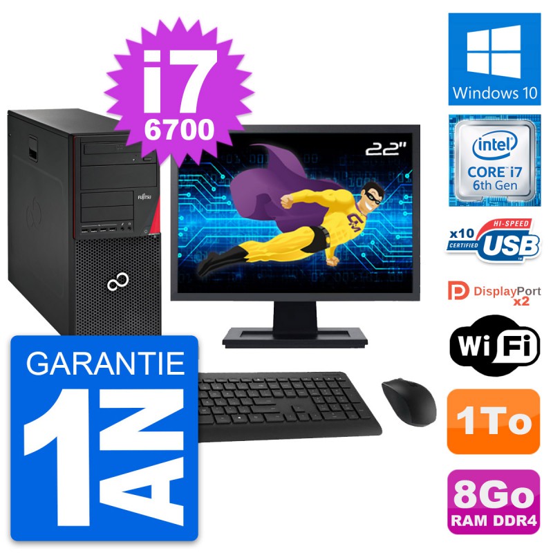 PC Tour Fujitsu Esprimo P756 MT - Intel Core i7-6700 3.4 Ghz (8 Mo) - 8 Go DDR4 - Disque Dur 3,5" 1 To - Clef Wifi USB - Graveur DVD - Windows 10 - Livré avec Ecran 22" + clavier + souris (Marques et modèles variables) - Garantie 1 an.