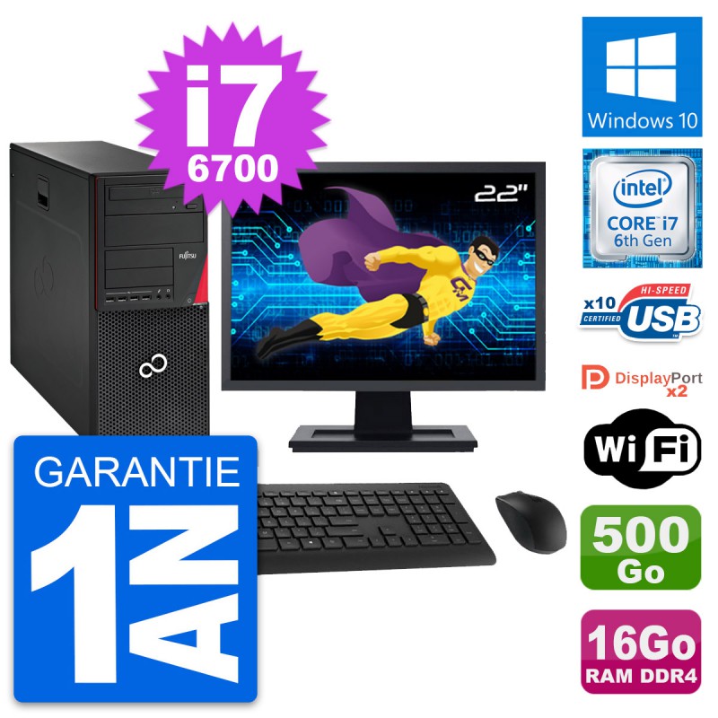 PC Tour Fujitsu Esprimo P756 MT - Intel Core i7-6700 3.4 Ghz (8 Mo) - 16 Go DDR4 - Disque Dur 3,5" 500 Go - Clef Wifi USB - Graveur DVD - Windows 10 - Livré avec Ecran 22" + clavier + souris (Marques et modèles variables) - Garantie 1 an.