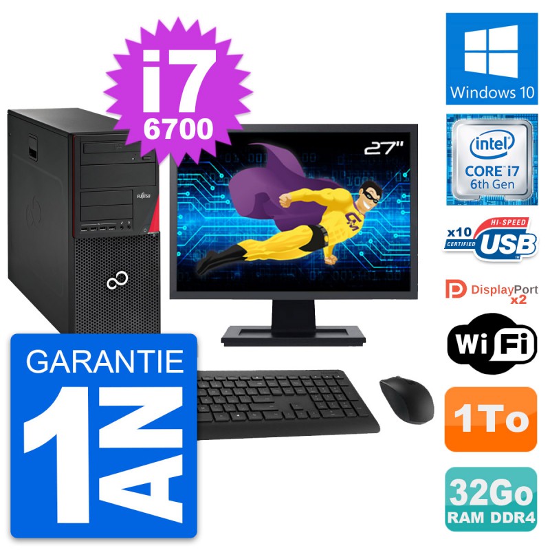 PC Tour Fujitsu Esprimo P756 MT - Intel Core i7-6700 3.4 Ghz (8 Mo) - 32 Go DDR4 - Disque Dur 3,5" 1 To - Clef Wifi USB - Graveur DVD - Windows 10 - Livré avec Ecran 27" + clavier + souris (Marques et modèles variables) - Garantie 1 an.