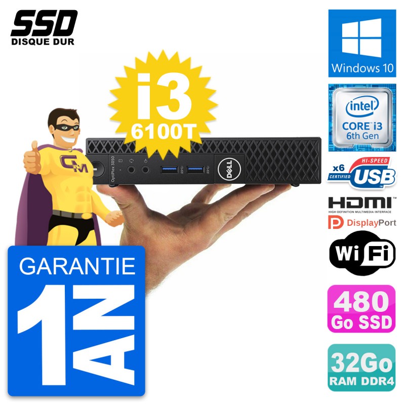 Mini PC Dell OptiPlex 3050 Micro - Intel Core i3-6100T 3.2 Ghz (3 Mo) - 32 Go DDR4 - SSD 480 Go - Clef Wifi USB - Windows 10 - Garantie 1 an.